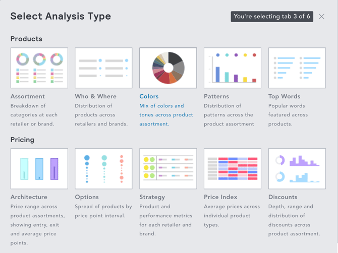 Colors shows the assortment of color as per the products in your workbook. You can view this as an aggregate or split it out further using EDITED's Chart Controls.